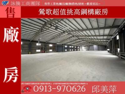 《詠騰工商團隊》專營桃園廠房工業地出售出租案名:鶯歌超值挑高鋼構廠房[價格]:22000萬[坪數]:約1560坪【權狀+增建坪數】[地理位置]:近大湳交流道★特色說明:1.臨路10米